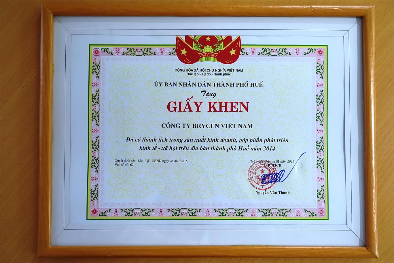 株式会社ブライセン(代表取締役社長:藤木 優、本社:東京都品川区)は、ベトナムに設立した当社の100%子会社BRYCEN VIET NAM(社長:鎌田 大介、本社:ベトナム社会主義共和国フエ市)が、本年2月5日、ベトナム・フエ市における経済発展への貢献が評価され、ベトナム・フエ市より表彰状を授与されましたことを発表します。